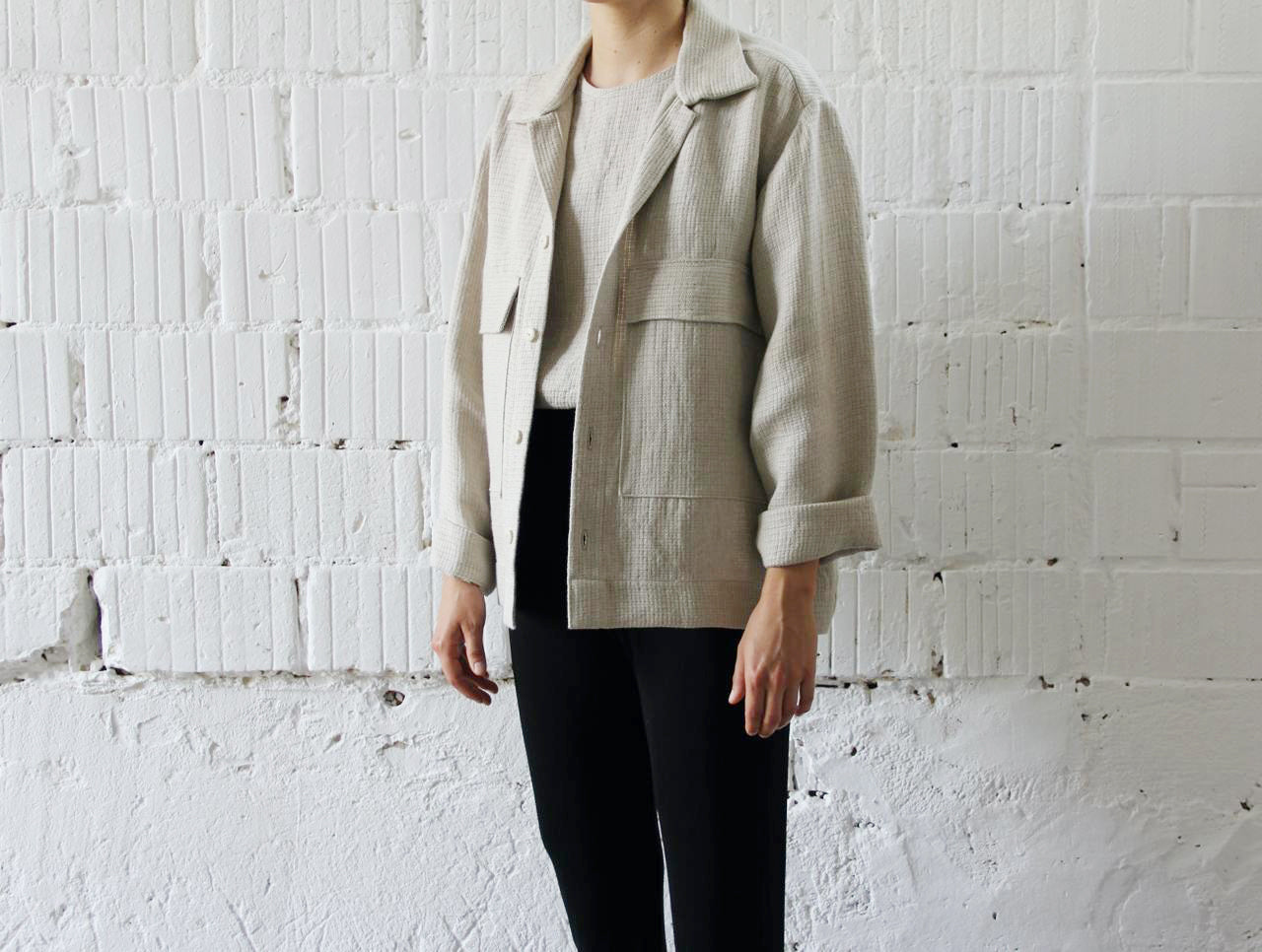 Weitgeschnittene Leinen Jacke mit aufgenähten Eingriffstaschen und Steinnussknöpfen.